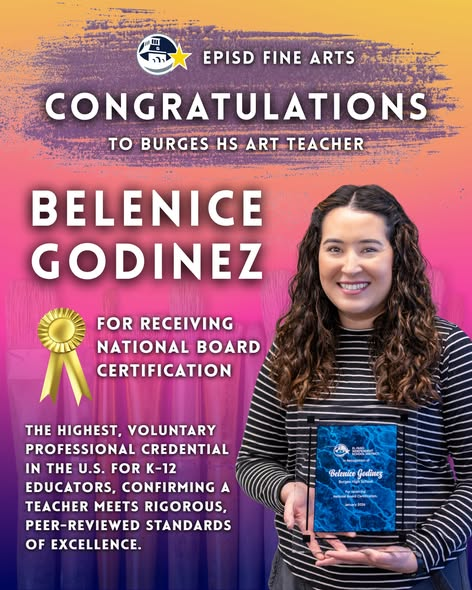 At the heart of El Paso Independent School District’s (EPISD) Fine Arts Department is a dedication to inspiring students and nurturing their creative voices. This week, we celebrate Burges High School art teacher Belenice Godinez, who recently earned National Board Certification, one of the highest professional recognitions for educators.