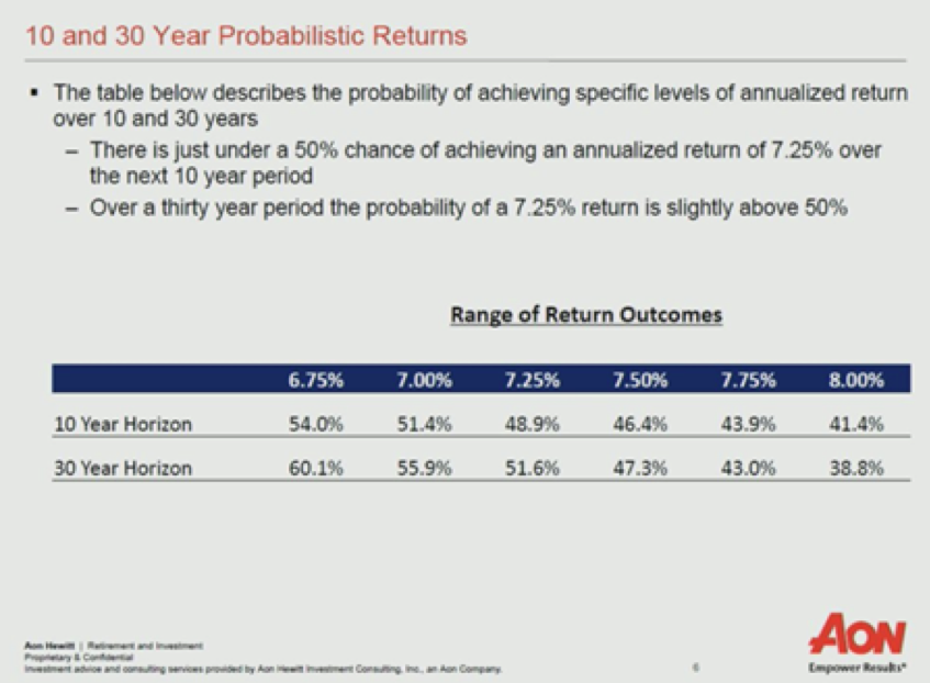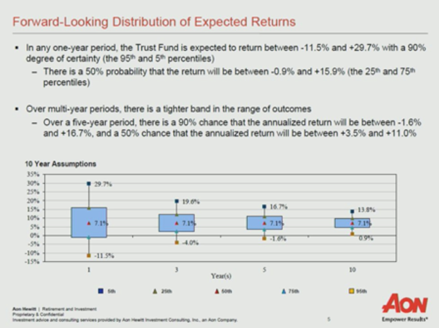 The TRS Board of Trustees heard a presentation on Capital Market Assumptions by Steve Voss and Mike McCormick of Aon Hewitt, providing analyses about past market returns and volatility, expected inflation, and what TRS can expect from the market over the next 10 to 30 years.