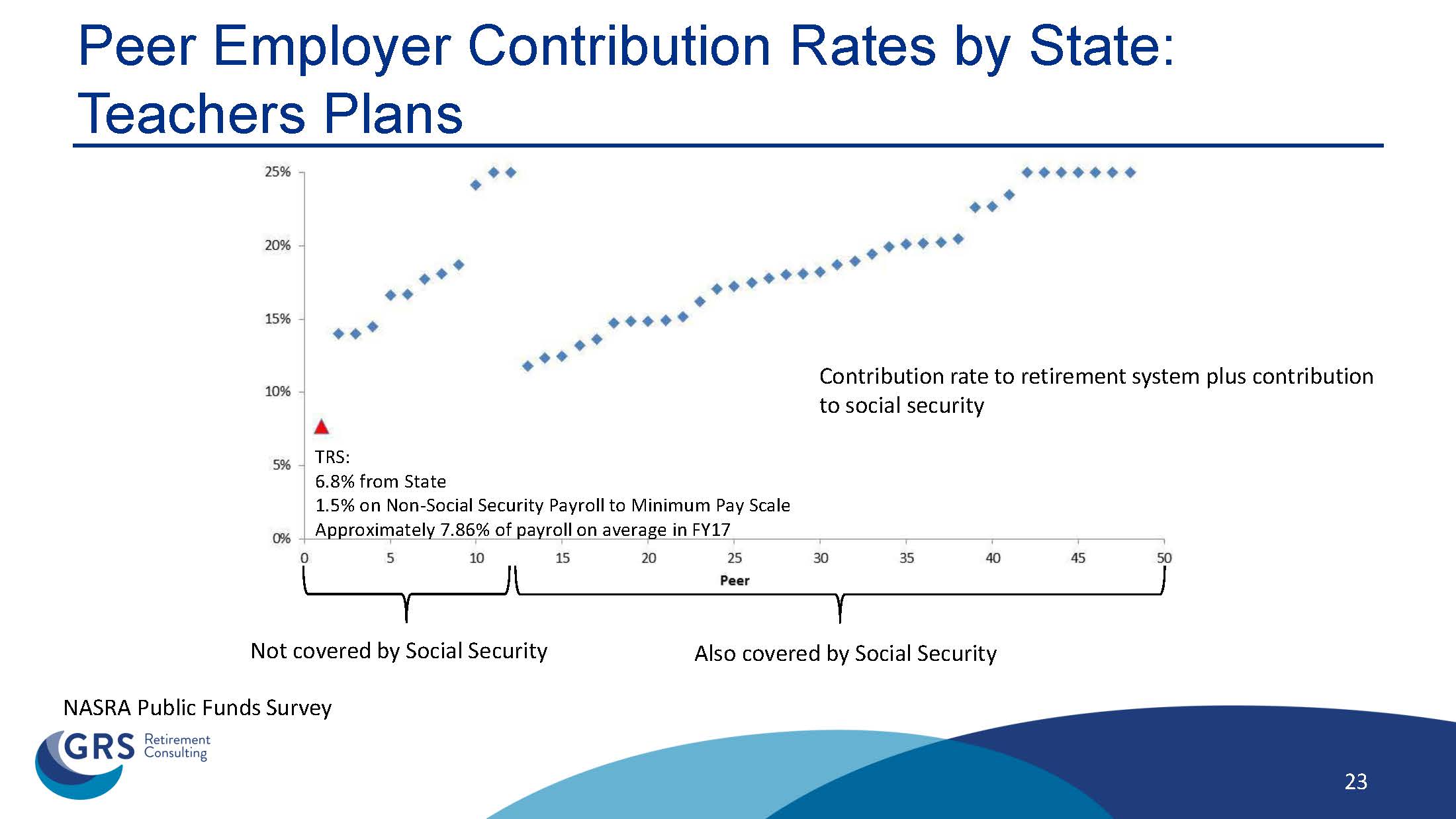 Currently, TRS receives a 6.8 percent contribution rate from the state of Texas, which is about half as much as the next highest state among its peers.